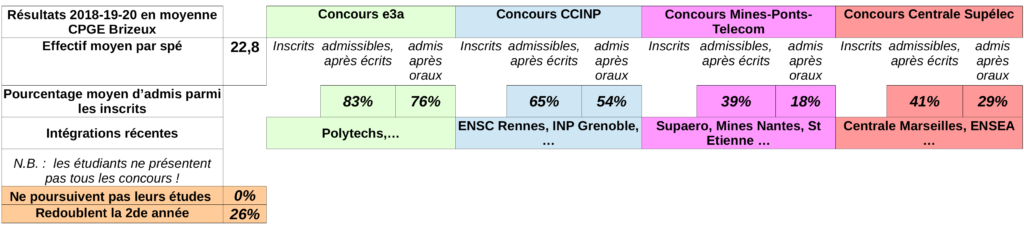 Nos résultats sont stables et toujours marqués par un fort taux de passage de 1ère année vers la 2ème année, puis un fort taux de réussite de nos élèves de 2ème année aux concours (figure suivante : bilan sur 10 ans). Y compris sur des écoles parmi les plus prestigieuses (intégrations sur les concours Centrale, Mines, …), chaque année à Quimper via nos classes.